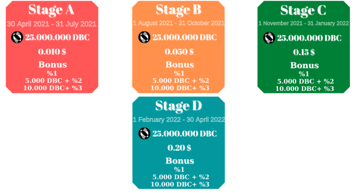 ICO pre-sale is scheduled to start on April 30, 2021 and last for a total of 1 year, with 4 stages. The ICO Period will be terminated on April 30, 2022, and DBC token volumes staked by investors will be distributed to wallet addresses. These stages and conditions are determined by our team as follows.